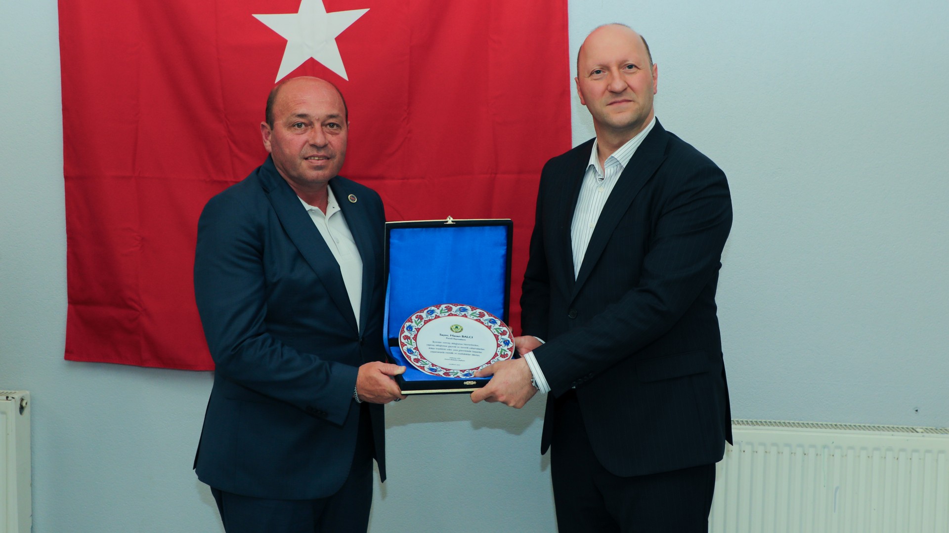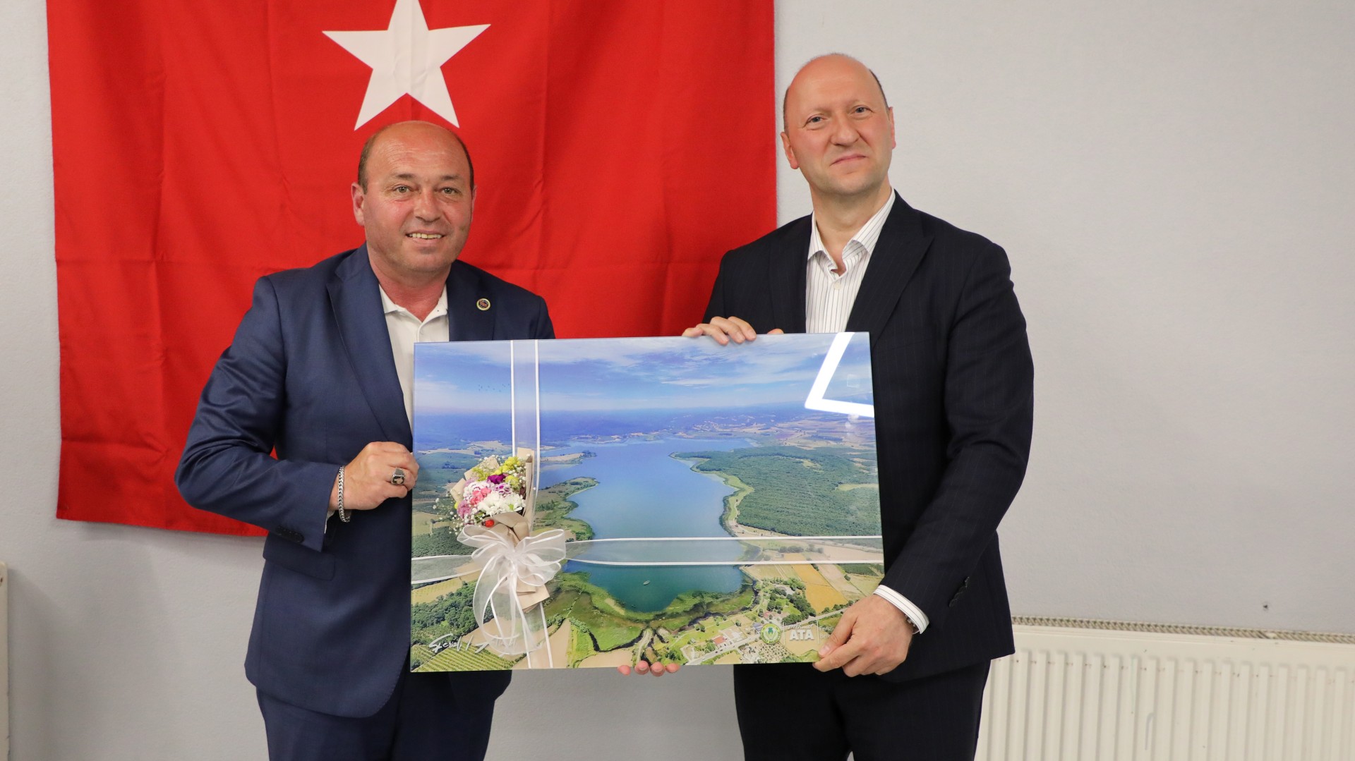 Sakarya Ticaret Borsası Başkanı Mustafa Genç, Kaymakam Balcı ve Komutan Koç'a Piri Reis dekoratif kum saati tablosu sunarak, Ferizli'ye sağladıkları değerli hizmetlerden dolayı teşekkürlerini iletti.