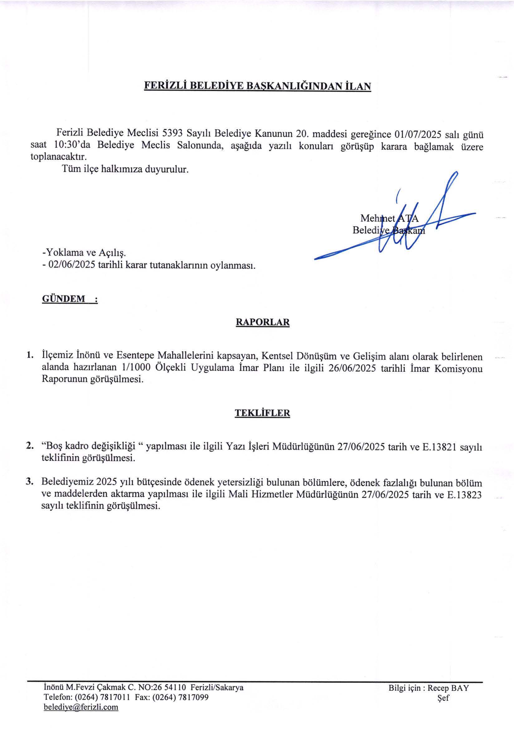 T.C. Ferizli Belediyesi Temmuz Ayı Meclis Gündemi (01.07.2025 Salı) T.C. Ferizli Belediyesi Temmuz Ayı Meclis Gündemi (01.07.2025 Salı) Foto Galeri için tıklayın...
