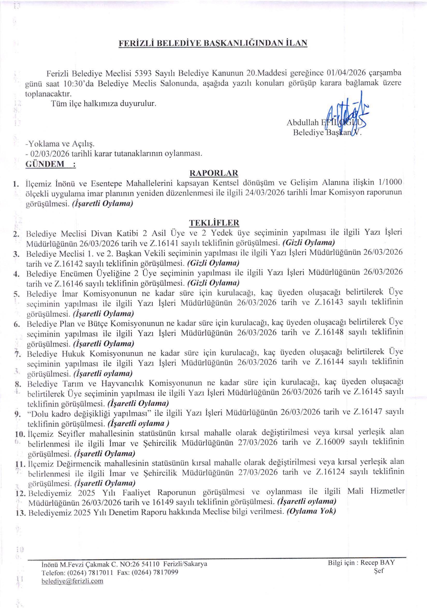 T.C. Ferizli Belediyesi Nisan Ayı Meclis Gündemi (01.04.2025 Pazartesi)