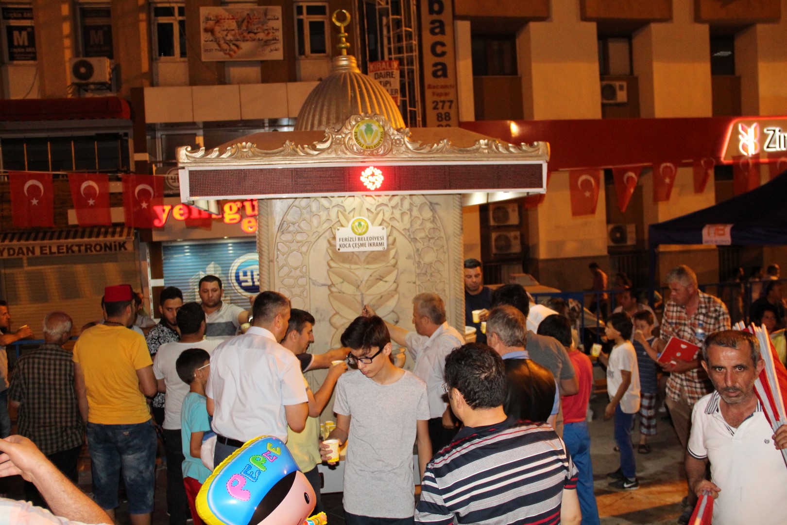 Ferizli Belediyesi tüm özel günlerde ve etkinliklerde kurduğu ikram çeşmesini yine Sakarya Demokrasi Meydanı ’a kurdu. Meydanda toplanan binlerce coşkulu kalabalık ikram çeşmesine rağbet göstererek belediyeye teşekkür ettiler.
