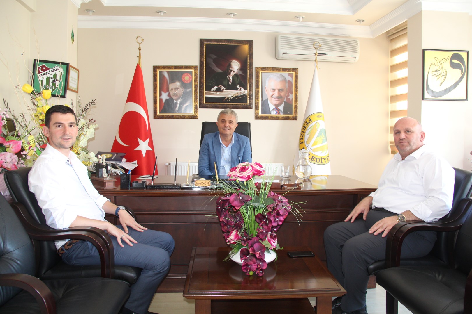 Ferizli Devlet Hastanesi Başhekimi Uzm. Dr. Samet Kaymaz, Hastane Mali İşler Müdürü Muhammed Durmaz ile birlikte Belediye Başkanı Ahmet Soğuk’u makamında ziyaret ettiler. Başkan Soğuk’a, sağlık ve sağlık kuruluşlarına vermiş olduğu desteklerinden dolayı teşekkür ettiler.